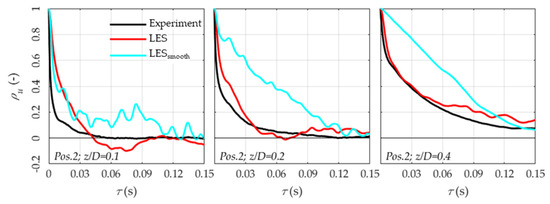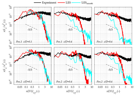 Figure 12 shows the power spectral densities for both positions at experimentally measured heights, close to the roof (z/D = 0.1) and far from it (z/D = 0.4 and z/D = 0.6). Close to the roof, both LES computations in smooth and turbulent inflow gave similar results, thereby indicating that in that that location, turbulence is affected mostly by the leading-edge separation. Up to nD/Uref~0.2, LES presented peaks that could be ascribed to the presence of a vortex shedding, but experiments do not confirm that result. However, the experimental results might be affected by the incapacity of hot-wires in capturing reversed flow. At z/D = 0.6, LES and experimental results are very close for both positions, while LESsmooth fails in capturing any aspect of the behavior. This shows that a longer sample time might be needed in the absence of turbulence, prompting a reflection on the cost-effectiveness of simulations requiring the generation of turbulence at the inlet. It can be also evidenced that LES spectra experienced a sharp fall at nD/Uref > 1, where the filtering of turbulence due to the spatial refinement of the mesh takes place. Nevertheless, the mesh quality was adequate for the present analysis, as a large portion of the sub-inertial range was captured correctly. Those results are confirmed by the calculation of the integral length scale of turbulence using the autocorrelation coefficient, whose values are shown in Figure 13. Close to the ground, LES results do not match experimental ones, while at z/D~0.6 the presence of inlet turbulence is responsible for good matching with experimental data. The effect of the short sample time can be seen, as LES data do not cross the abscissa in a similar way to the experimental data.