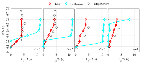 Figure 14 shows the longitudinal integral length scale of turbulence Lu/D at roof level positions, which is calculated using the Taylor hypothesis through the integral of the autocorrelation function up to the first zero-crossing, multiplied by the mean velocity U. The integral length scale shows a steady growth up to a height of z/D~0.22 at position 1 (0.45 at other positions). At greater heights, Lu keeps growing with a different but slower rate up to a maximum point at z/D~0.55, and hints at a slow decrease for even greater heights z/D > 0.7. At z/D~0.55 the probe is in a region of the flow with high shear stresses, which might explain the larger length scale measured in the experimental tests and not captured by the numerical solver. Concerning LESsmooth, results show that the length scale is greatly overestimated for z/D > 0.2. That outcome is coherent with the very low turbulence intensity shown in Figure 9 for the corresponding calculation. On the contrary, LES results with fluctuating inflow match well with experimental data, especially for position 1. At other positions, LES slightly underestimates the length scale by a factor of about 20%: that might be explained considering the overestimation of the turbulence intensity inside of the separation bubble shown in Figure 9, which might be solved either by improving the mesh refinement in the wind tunnel fetch length or increasing the sample time.