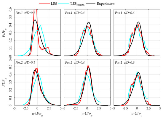 Figure 15 shows the probability density functions (PDFs) for position 1 and position 2 at the heights shown in Figure 12. Those PDFs help with understanding the performance of the method with regard to higher-order statistics, especially the behavior of extremes. LES predicts the behavior analogously with wind tunnel experiments at all heights. At position 1 near the wall, the behavior is consistent for LES and the wind tunnel; however, the effect of the short sample time can be noticed with emphasized probability peaks in the PDF, as predicted. A slight mismatch can also be noticed for , which is compatible with the higher turbulence intensity generated at the inflow. For smooth inflow, LESsmooth yields an unphysical PDF near the wall, in this case dangerously underestimating the maximum of the distribution. In fact, experimental data suggest fat positive tails, which smooth LESsmooth does not record. At other positions, the behavior is consistent between both LES simulations. At the roof the PDF is generally not normal at all heights, which differs from the atmospheric wind condition normally accepted in the literature [29].