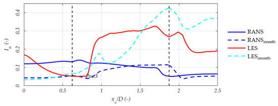 Figure 9 shows the longitudinal turbulence intensity. Concerning RANS, Iu was calculated from the turbulent kinetic energy K using the condition of isotropy of the turbulent scales reading . RANSsmooth and LESsmooth (dashed lines) both underestimated turbulence by >60%, and yielded an unphysical position of the Iu peak over the roof, indicating a high position of the shear layer, hence confirming the necessity of introducing turbulence in the inlet to improve accuracy.