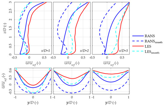 Figure 19 shows the turbulence characteristics measured in the wake region. As the wake decays, turbulence intensity should physically reduce and uniform to the freestream atmospheric flow [9,34]. However, RANS shows an analogous turbulence intensity at the registered distances for both smooth and fluctuating inflow cases, which is an unphysical behavior. Vice versa—LES correctly models the decrease in turbulence intensity for both cases, with the LES in turbulence showing the most rapid decrease. To correctly model the flow behavior, the inclusion of turbulence effects is therefore fundamental, but it does not ensure RANS will improve the behavior significantly in this region.
