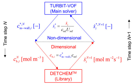Figure 1 schematically illustrates the data exchange procedure between the two computer codes at the reactive wall. Non-dimensional variables in TURBIT-VOF and dimensional variables in DETCHEMTM are converted via reference values (, ). At time step , wall concentrations from TUBBIT-VOF are used as inputs for DETCHEMTM to calculate the surface reaction rates by Equation (10). Since TURBIT-VOF is based on a finite-volume method, (non-dimensional) bulk concentrations are associated with mesh cell centers. Values of in mesh cells adjacent to the wall are therefore extrapolated to bulk concentrations at the catalytic surface () and are converted to dimensional values .