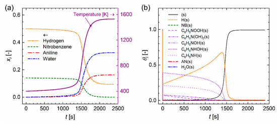 As a first study of the ad hoc reaction mechanism given in Table 1, the test case of a continuously stirred tank reactor is computed. The pressure for this calculation is 0.4 MPa. The initial temperature is 400 K, which is the minimum valid temperature for the mechanism. The reactor volume and catalytic surface area are 1 and 1 , respectively. Initial species composition (in terms of mole fractions) consists of 14% of nitrobenzene, 50% of hydrogen and the rest being nitrogen as an inert species. Surface sites are initially vacant and free of any surface species represented by the unity site fraction of Pd, . With these conditions, DETCHEMCSTR [45] computes zero-dimensional species and energy equations. Thermodynamic properties for the species employed in this reaction mechanism are estimated by the set of polynomial coefficients from Burcat and Ruscic [57].