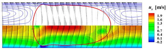 Computed quasi-steady bubble shapes (thick red lines) and velocity fields (vectors) in the fixed reference frame (lower half) and in the moving reference frame (upper half), identical to Case 2 in Woo et al. [46].