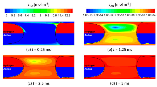 Concentrations field of bulk species hydrogen (top half of each sub-image) and aniline (bottom half) at different times: (a) 0.25 ms, (b) 1.25 ms, (c) 2.5 ms and (d) 5 ms.