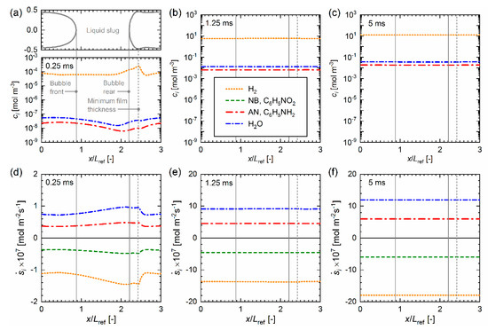 Figure 7 shows the instantaneous distributions of bulk species concentrations at the wall and the production or consumption rates of bulk species as results of surface reactions. As Equation (5) is not solved for bulk nitrobenzene, its concentration is not displayed in Figure 7a–c, while its consumption rates are presented in Figure 7d–f. For , Figure 7a,d clearly show the variation of concentrations depending on the bubble location. At the position of minimum film thickness, the hydrogen concentration in Figure 7a is highest due to the shortest diffusion path, and the production/consumption rates for all bulk species in Figure 7d are highest, accordingly. However, the highest concentrations of reaction products in Figure 7a occur at . The distance is approximately 2.4 and corresponds to 35.1% of bubble travel distance with the bubble velocity of 1.367 m/s in this case. For , the profiles of concentrations and production/consumption rates are almost independent of the bubble location, while for they are uniform. The concentration of hydrogen at the wall gradually increases because of mass transfer from the bubble to the wall. Accordingly, the production/consumption rates and the concentrations of the reaction products increase with increasing hydrogen concentration.