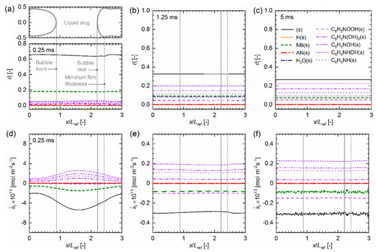 Figure 8 exhibits the distributions of surface site fractions and the production or consumption rates of surface species at the same time instants shown in Figure 7. The curve denoted by (s) represents the vacant fraction of the surface site. The catalytic surface, which is initially set to be vacant , is immediately occupied by approximately 20% of adsorbed nitrobenzene as a result of pseudo-equilibrium in the DETCHEMTM library. According to the profile of the vacant surface site fraction, , the highest occupancy of surface site at is observed at the position of minimum film thickness, which is consistent with the bulk species production/consumption. However, the position where the highest production or consumption of surface species occurs is near the center of the liquid slug, as shown in Figure 8d. This indicates that the surface site in the liquid slug is initially less occupied due to the absence of hydrogen in the liquid slug at the beginning of calculation. The axial site fraction profiles at are almost uniform, while the corresponding surface production/consumption rates still show slight location dependency. The site fractions of surface species rapidly increase between 0.25 and 1.25 ms, and then slightly change from 1.25 to 5 ms. Accordingly, the rates of changing surface species at 5 ms are nearly two orders of magnitude smaller than those from previous time instants.