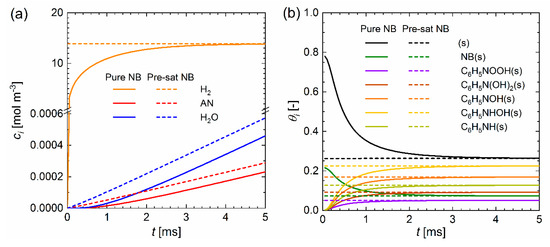 Time evolutions of mean concentrations of bulk species (a) and mean site fractions of surface species (b). Solid lines represent the initial condition of liquid as pure nitrobenzene, while dashed lines represent the case initialized with nitrobenzene pre-saturated with hydrogen.