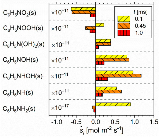 Figure 10 compares the rates of production or consumption of surface species varying with respect to the progress of mass transfer starting from the initially pure nitrobenzene and vacant surface sites. Three time-instants, 0.1, 0.45 and 1 ms, representing different characteristics, are chosen. Before 0.1 ms, hydrogen is lacking at the surface. In the period between 0.1 and 0.45 ms, hydrogen reaches the surface, but the site is not sufficiently occupied. After 1 ms, the surface site coverage becomes almost constant in time. At the three time-instants, and are most sensitive depending on the variation of surface site coverage—produced in the beginning and switched to consumption after a short period. Adsorbed nitrobenzene is always consumed as a major reactant and the other surface species are always produced in the reaction process. The productions of intermediate surface species are mainly caused as results of forward chain reactions from nitrobenzene, while the consumption of surface aniline at 1 ms is presumably due to the loss by desorption to the bulk. The rates of changing and decrease monotonically as reactions progress, while those for the other species are non-monotonic. Most of production/consumption rates are highest near The magnitudes of production/consumption rates correspond to the extent of activation energy specified in the reaction mechanism.