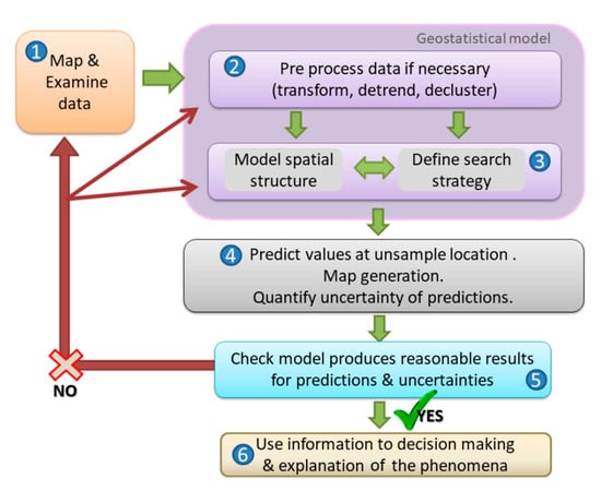 Detailed workflow for geostatistical studies and building a spatial model from step 1 to 6. The arrows in color show the workflow of the different processes (in boxes) to apply an accurate geostatistical model. In the circles are the outputs to be spatially georeferenced into a shapefile. The black arrows that come out of a process box indicate a result, while when they point to the process, it means input for the application.