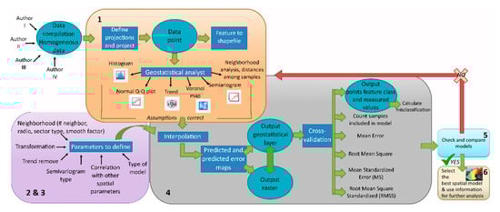 Geostatistical modeling was applied using ArcGIS, Geostatistical Analyst extension (10.4.1, Geostatistical Wizard tool code, ESRI Inc., Redlands, CA, USA []), and RStudio (3.1.3) following a six steps workflow (Figure 1 and Figure 2). The data compilation, georeference, and exploration (step 1) are most laborious and time-consuming and required for further data pre-processing (step 2). After these two steps, the model can be built by applying interpolation techniques with a low computational cost. The configuration of the parameters included in the model is the essential step since it defines the modeling strategy (step 3) and, consequently, the prediction of values at unsampled locations (step 4) and the outcome: a surface map based on statistically and spatially reasonable results for predictions and interpolation error (step 5) that displays the distribution pattern of the phenomenon (step 6). Expert knowledge on the processes involved for the target variable to model as well as statistically significant evaluation values, provide the continuity on the workflow to the use of the final output or a re-start of the workflow.