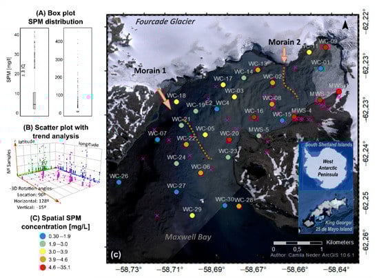 Suspended particulate matter (SPM) measured at least once during summers among two decades (1992–2012) in Potter Cove. (A) Data distribution by a boxplot. (B) Scatter plot with trends in sample densities variability. (C) One-day of SPM concentration sampling on 9 February 2010 in Potter Cove’s upper water column (WC stations) and its meltwater streams (MWS stations). Red and blue colors highlight extreme high and low values. Moraine from Wölfl et al. []. Base map: Digital Globe (2014).