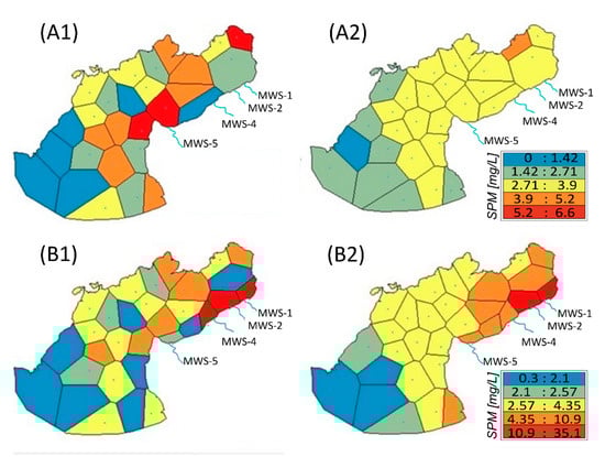 One-day SPM data without (data set A) and with meltwater streams (MWS) input (data set B) differ spatially concerning the interpolated pattern of SPM concentration. In both cases, Voronoi (Figure 4) and natural neighbor (Figure 5) analyses indicate higher values in the inner cove and near the southern Potter Peninsula coast as well as low values in the outer cove close to Maxwell Bay. The simple Voronoi SPM distribution based on the measured values recorded at the sampled location reveals high spatial variability of SPM concentrations with three areas with high values or outliers (Figure 4A1,B1). Remarkably, high values or outliers (5.2–6.6 mg/L SPM) identified by the red polygon class surrounded by low values (0–2.71 mg/L SPM) appear in data without meltwater discharge points included near MWS-5 and in the northern regions of the inner cove (Figure 4A1). On the contrary, the simple Voronoi with local MWS discharge input identifies high values near the area of all MWS except the MWS-5 (Figure 4B1). The mean Voronoi for data set B produces a smooth gradient of SPM concentrations across the entire cove from the outer western edge toward the inner south-eastern coastline (Figure 4B2).