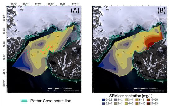 This selected model (EBK8) with MWS inputs show a clear gradient of SPM distribution from high to low from the inner east coast to the outer west coast. An approximate area of 2 km2, between 1.5 and 1.7 km of distance to the Fourcade Glacier front, has mid-high values (4–35 mg/L) with high concentrations (7–35 mg/L) up to ~300 m distance to the SPM origins of MWS stations. Low concentrations (0–2 mg/L) are close to open sea conditions with more than 2 km of distance to MWS. These areas coincide, respectively, with the meltwater fjord and marine habitats at the inner and outer cove from Jerosch et al. [] (Figure 4d from Jerosch et al., 2018), which shows the spatial extent of glacier influence in the cove. Glacier retreat with non-measured SPM input at the west coast or underwater could affect the predicted SPM concentrations. This material input will either sediment in a significant proportion, remain in the water column and transported among the cove, or be exported into Bransfield Strait []. But the outcome of this study has shown its superficial distribution. The high SPM concentration at the inner cove could also be deposited or be longer suspended, modifying the marine ecosystem (e.g., salinity conditions, light availability, carbon and iron concentrations) and making this area vulnerable to changes in the pelagic and benthic community [,,,]. Consequently, since glaciers are retreating among the entire west Antarctic Peninsula [], ecosystem changes at PC due to increased SPM concentration can be expected in Antarctic fjords and coastal areas influenced by retreating glaciers.