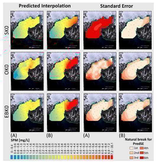 Six default geostatistical models. (Left): data distribution and interpolation results for SPM in Potter Cove for 09/02/2011 without (A) and including meltwater with SPM input by meltwater streams (B) using Simple Kriging (SK), Ordinary Kriging (OK), and Empirical Bayesian Kriging (EBK) models. (Right), (A,B): predicted standard error (PredSE) to reveal the scope of feasible interpolation area. Best models are determined automatically by the ArcGIS tool with a mean close to zero and a root mean squared standardized error close to one.