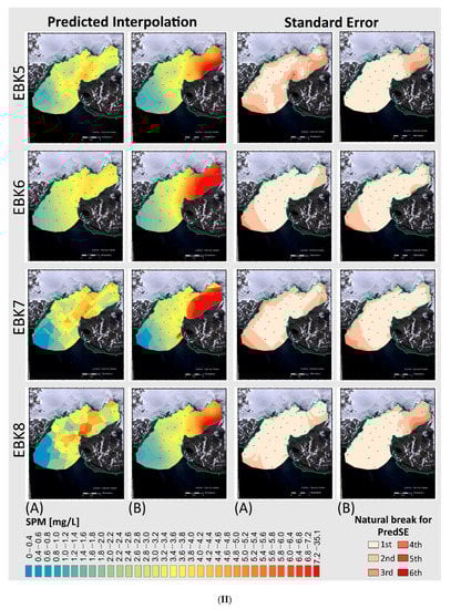 (I) Predicted suspended particulate matter (SPM) interpolations and predicted standard error (PredSE) maps for one mean meteorological summer day (A) without and (B) with meltwater streams SPM concentration data (continued in II). Eight tuned geostatistical models: Simple Kriging (SK), Ordinary Kriging (OK), and Empirical Bayesian Kriging (EBK) models The SK2A model in Figure 7I, was not performed because the trend removal with optimization was not applicable due to a required estimation of the tendency at each location instead of a general one.