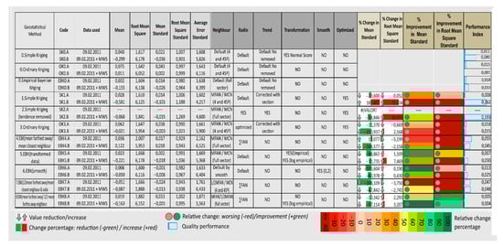 Three indices were developed to evaluate performance differences regarding the modeling strategy applied. The MS (1) and RMSS (2) improvement indices were based, respectively, on the MS or RMSS change rate percentage between a configured geostatistical model by default and the tuned model and by the distance to the optimal value (zero for MS and one for RMSS). Each index presumes an improvement of the default model in the configured model. A weighted performance index was applied for each model as RMSS is assumed to be the most restrictive parameter (RMSS factor 0.7; MS, factor 0.3).
