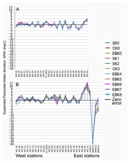 A statistical error analysis is used for the assessment of improved/deteriorated model performance (Figure 8). Ordinated by mean standardized (MS) ~0 and root mean square standardized error (RMSS) ~1, the default model OK0 and the configured model EBK8 perform best, while SK2 performs worst (Table S2). Regarding improvements indices Equations (1) and (2), about 70%, i.e., 11 out of 16 geostatistical models, have achieved an improved MS, whereas only ~31%, i.e., 5 out of 16, are improved in RMSS. EBK8 is the only configured model with improvement in MS and RMSS for both SPM data sets with and without MWS input. A particularly high improvement in MS (97.11%) and RMSS (74.92%) is for the EBK8B model of one-day SPM data with MWS sediment discharges (Table S1).