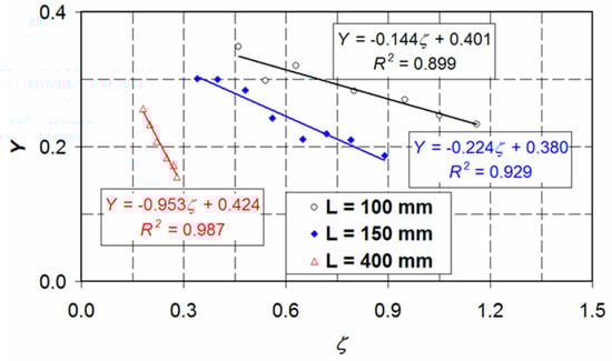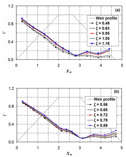 Figure 2b shows the variation of the relative curvature of the free surface, , in the streamwise -direction. Note that the approximate limit where the curvature of the upstream free-surface profile becomes insignificant is at or from the upstream edge of the trapezoidal-shaped weir. Upstream of this station, the effect of non-hydrostatic pressure distribution on the flow characteristics is insignificant (), implying that this location is the nearest station for the correct measurement of the overflow depth under free-flow conditions. The result obtained is in agreement with the general rule recommended by Clemmens et al. [29] for the position of the gaging station. In the flow region downstream of this station, the convex () and concave features of the free-surface profile are clearly seen from Figure 2b. For the range of relative overflow head considered, all the experimental free-surface profile data collapse close to the average curve (see Figure 2a). In comparison, the free-surface profiles of a trapezoidal broad-crested weir are only similar in the flow region upstream of the downstream edge of the weir crest (see, e.g., [13,30]). Over the downstream face, the profiles do not exhibit self-similarity. Similar results were also reported for the free-surface profile of a rectangular broad-crested weir [8,9].