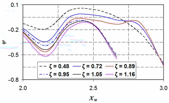 The experimental data of Zerihun [2] were further analyzed to examine the variation of the normalized dynamic bed pressure, ( is the dynamic bed pressure due to the vertical acceleration of the flow), over the crest of the weir. The results are shown in Figure 5. For , the values of the dynamic bed pressure are negative along the crest due to the effect of the pronounced curvature of the convex-shaped free-surface profile. As expected, the magnitude of the dynamic pressure at a section increases with increasing the relative overflow head. Near the downstream crest edge, the dynamic pressure curve falls sharply due to the high vertical velocity of the supercritical flow caused by the strong streamline curvature. Consequently, the resulting maximum dynamic bed pressure in the convex flow region significantly reduces the magnitude of the total bed pressure, as depicted in Figure 3.