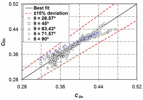 The coefficient of determination and the root mean square error leading to the above equation are 0.91 and 1.11%, respectively. The result of the calibration is shown Figure 6, which compares the numerically computed discharge coefficient,, with the experimental value, . Note that all computed points fell in the error bandwidth of ±10%. It is pertinent to note that Equation (7) is limited to the ranges of the flow parameters indicated in Table 1. Additionally, it is restricted to free flow over a horizontal crest weir with mm.