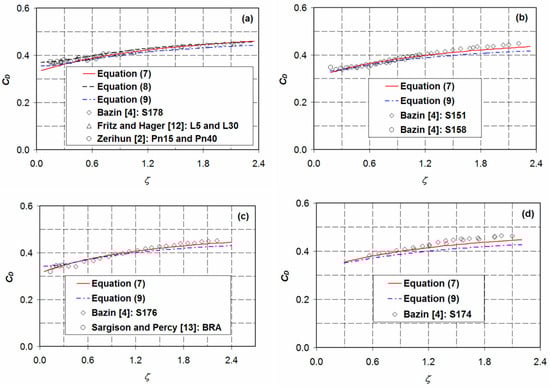 where is in radian. As shown in Figure 7, the agreement between the results of Equation (7) and the experimental data is relatively close, with maximum and mean relative errors of 6.53% and 1.70%, respectively. For the higher discharges , the results of Equation (9) start to deviate from the measurements due to streamline curvilinearity, which is augmented by the effect of the downstream-face slope (see Figure 7b–d). This evidently demonstrates the influence of the dynamic effects of the flow on the discharge characteristics of a trapezoidal-shaped weir, as noted by Zerihun and Fenton [36]. Overall, the results of Equation (7) show a significant improvement over the predictions of Equation (9), especially for short-crested weir flows.
