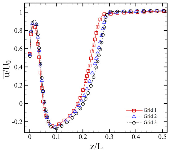 The implications of spatial grid quality was determined using three cases: grid 1, grid 2 and grid 3. Table 1 shows the drag coefficients for different grids for the Ahmed body with slant angles and at a Reynolds number of . Mesh refinement from grid 2 ( elements) to grid 3 ( elements) had no considerable effect on the drag coefficient, where the variation was less than . Furthermore, Figure 2 shows that the difference of streamwise velocity in the wake of the Ahmed body model for grid 2 and grid 3 is less than . Thus, the mesh in grid 3 is sufficient for accurately capturing the mean drag coefficient of the Ahmed body.
