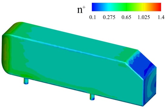 The non-dimensional wall distance () near the walls of the model is presented in Figure 3, which identifies that the average value of is less than 5. Thus, grid 3 is sufficient for accurately estimating the viscose sublayer [17].