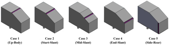 In this study, one SDBD actuator was placed in 5 different locations on the surface of an Ahmed body to determine the location that provides the best aerodynamic performance. The geometries of the Ahmed body and various locations have been indicated in Figure 5 and Figure 6. The actuators were designed following Suzen and Huang (2005) [18]. Four cases were investigated based on the locations of the actuators: on the connection part of the roof and slant (case 1), on the beginning part of the slant (case 2), at the middle part of the slant (case 3) and at the ending part of the slant (case 4). Furthermore, the effect of implementing two actuators on both ending parts of the model sides was investigated in case 5.