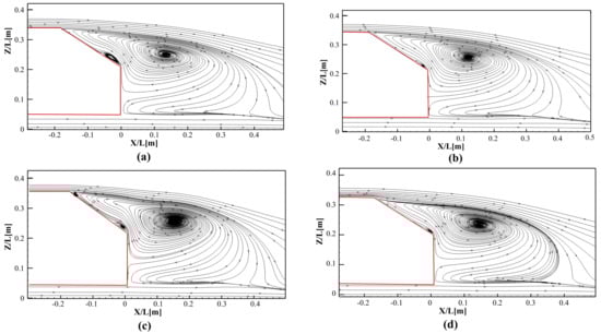 Streamlines on the symmetry plane for slant angle and . (a) Actuator off, (b) case 1, (c) case 2, (d) case 5.