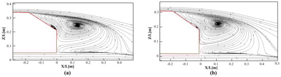 Streamlines on the symmetry plane for slant angle and : (a) actuator off; (b) case 2.