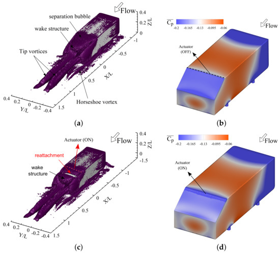 Isosurface plot of and contours of surface pressure for case 2 with the slant angle of . For (a,b) the SDBD actuator is off, and for (c,d) the SDBD actuator is on.