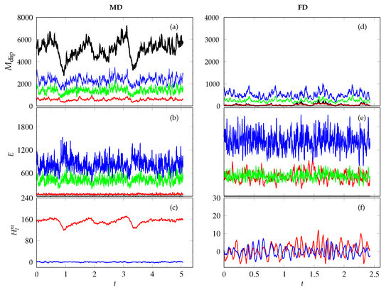 While typical, the spatial structures described in relation to Figure 4 are only snapshots of the three dynamo solutions at fixed moments in time. An illustration of the temporal behaviour exhibited in our dynamo simulations is shown in Figure 5. The main magnetic and kinetic energy density components of two distinct dynamo cases are plotted as functions of time, and the chaotic nature of the solutions is clearly visible. The time dependence of the time series consists of continual oscillations around the mean values of the respective densities with periods much shorter than the viscous diffusion time. Kinetic energy densities are displayed in the second row of the figure and show that the fluctuating components of motion dominate the flow with the fluctuating toroidal velocity being the strongest. The mean poloidal component of motion is negligible in both cases in agreement with the constraint of the Proudman–Taylor theorem on motions parallel to the axis of rotation. The mean toroidal component, representing differential rotation, appears to be weak in both cases plotted in Figure 5 more so in the case to the left marked MD for reasons we will discuss further below. The differential rotation, however, is known to be the component most strongly impaired in the presence of the magnetic field [34]. This leads us to a discussion of the features of the magnetic energy densities plotted in the first row of Figure 5. Here, the differences between the two cases illustrated are rather more pronounced. The total magnetic energy density of the case in Figure 5a is approximately six times larger than that in Figure 5d. More significant is the essential qualitative difference in the balance of magnetic energy components. The axisymmetric poloidal component is dominant in the case shown in Figure 5a while it has a relatively small contribution in the case of Figure 5d. The axial dipole coefficient and the axial quadrupole coefficient in Figure 5c,f reveal that this difference is due to the fact that the case to the left is dominated by a strong dipole and the case to the right is less strongly dipolar and the time series suggests the presence of magnetic field oscillations.
