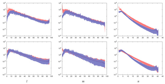 Typical power spectra of velocity (blue) and magnetic field (red). The top row shows an MD dynamo solution whereas the bottom row shows an FD dynamo solution both at , 1,500,000, , and . From left to right, power spectra as a function of the spherical harmonic degree l, order m, and Chebychev polynomial degree n are shown, respectively. Lines represent the average spectra and shaded areas go from the minimum to the maximum values for each mode in the averaging period. A period of one viscous-diffusion time unit is used for the time-averaging period in both cases. (Colour online).