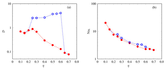 Bistability as a function of the shell thickness aspect ratio . (a) The dipolarity ratio and (b) the Nusselt number at in the cases , , and . Full red and empty blue circles indicate FD and MD dynamos, respectively. Red dotted lines and blue dotted lines connect dynamos that were started from FD and MD initial conditions, respectively. (Colour online).