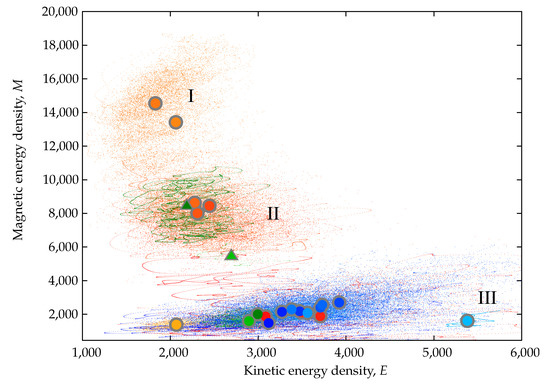 It is also interesting to note that there is a clear division between MD and FD dynamos also in the energy density space. Figure 9 shows a compilation of plots of magnetic energy density as a function of kinetic energy density. Dots represent instantaneous values; circles/triangles are mean values over time. The aspect ratio, , increases from darker to lighter colours. Blue dots and circles represent simulations that started off as fluctuating dipolar dynamos whereas warm colours and greens represent simulations starting off as mean dipolar dynamos. Green symbols and dots represent simulations starting off as mean dipolar dynamos at and which were repeated starting from a higher magnetic energy and lower kinetic energy (triangles) relative to the original simulations (circles). Three regions can be clearly identified that correspond to simulations that finished as high and low dipolarity MD dynamos (regions I and II in Figure 9), and to simulations that finished as FD dynamos (region III in Figure 9). It is evident that dipolarity is preserved throughout the computations (most warm coloured dots and circles end up in region I and II; all blue dots and symbols end up in region III). The exception to this rule happens when the magnetic energy density of the initial MD condition is not big enough or its ration to the kinetic energy density is small (green circles). In this case the solutions drift to an FD state and remain there. If, on the other hand, the initial MD condition sees its magnetic energy density scaled up sufficiently, the solution will remain an MD dynamo (green dots and triangles).