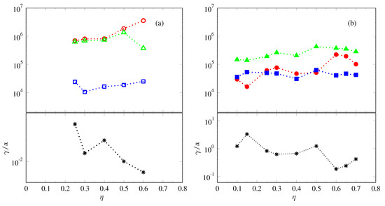 One of the most remarkable features of MD and FD dynamos introduced above is that these two very distinct types can coexist at identical parameter values. Coexistence was first reported in [29]. Indeed, in each of the Figure 5, Figure 6 and Figure 7, two different cases obtained at the same parameter values are shown. Within the parameter range of coexistence it is the initial conditions that determine which of the two chaotic attractors will be realised. Figure 8 shows the dipolarity ratio as a function of the shell thickness aspect ratio . Several observations can be made immediately. First, bistability only seems to occur for aspect ratios between and and both to the left and to the right of this interval FD dynamos are found. In contrast, alternating regimes appeared on each side of the hysteresis loop in previous studies [29,42] where continuation as a function of all remaining parameters R, P, and was performed. A further observation is that the FD dynamos have a decreasing dipolarity with increasing aspect ratio, that is, dipolarity seems to decrease with shell thickness. The MD dynamos, on the other hand, show little variation of dipolarity with aspect ratio but can still be separated into two groups, one for thin shells and another for thick shells. In this respect, it is apparent that thinner shells result in dynamos that are more dipole-dominated.