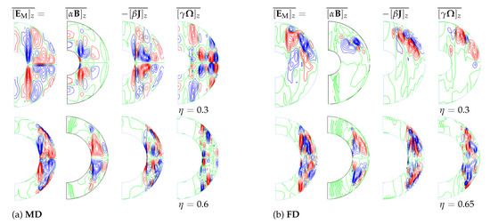 Figure 11 displays z-projections of the azimuthally-averaged components of the electromotive force. For the MD dynamo solutions, shown in (a), the -effect follows an antisymmetric pattern about the equator, just like the other effects. This behaviour is expected from the pseudoscalar nature of and the symmetry of magnetic fields in MD dynamos [20]. For FD dynamo solutions, such as those displayed in (b), the components of the electromotive force no longer exhibit antisymmetry about the equator. This behaviour is, in part, due to the more complex spatial structure of the magnetic fields of FD dynamos compared to MD dynamos. This feature, combined with generally weaker magnetic field strengths and different flow profiles (see Figure 5 and Figure 6, for example), results in the -effect being weaker for FD dynamos. Thus, both the - and -effects become of comparable importance in sustaining dynamo action.