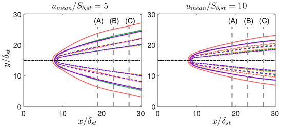 ) with 5.0 (left) and 10.0 (right). The dashed grey lines show the sampling locations (A, B, C from left to right), and the dotted black line shows the flame centre.