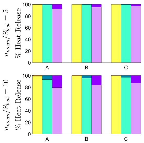 )) modes of combustion for 5.0 (1st row) and 10.0 (2nd row) at locations A, B and C (left to right).