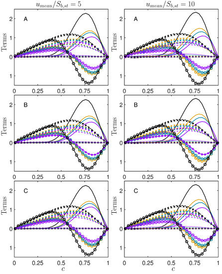 ) for 5.0 (1st column) and 10.0 (2nd column) at locations A, B, C (top to bottom). All terms are normalised by .