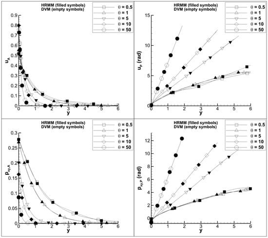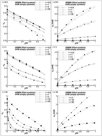 In Figure 1, the HRMM velocity and shear stress amplitude and phase distributions, with , are plotted and compared with the corresponding DVM ones for . Excellent agreement is observed for all four quantities , , , when , i.e., in moderate and low frequencies. For (high frequencies), the profiles of the velocity and shear stress amplitudes of the HRMM and DVM are also in very good agreement, but some discrepancies start to appear between their associated phase profiles. Then, for (very high frequencies), slight differences are observed in the amplitudes, while larger discrepancies are present in the phases, which, in general, are increased moving away from the boundary.