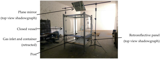 The resulting krypton cloud is visualized along two axes using Edgerton’s (1958) shadowgraphy technique [36]. A first camera looks at the cloud in a vertical transversal plane (front view) whereas a second one looks at the cloud from above (top view). To this end, the back panel is covered with a retro-reflective material, a similar panel is placed below the floor of the vessel and a plane mirror is positioned above the vessel. The lenses of the two cameras are equipped with small mirrors to direct the light on the same axis as the camera optical axis as shown in Figure 3. The cameras used are a Phantom V2511 for the front view and a Photron Fastcam SA-Z for the top view. The frame rate is 500 Hz for both cameras. The resolution of the shadowgraphs is 0.86 mm per pixel for the front view and 0.97 mm per pixel for the top view.