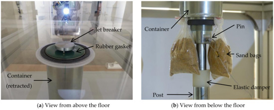 The floor is equipped with a retractable metallic cylindrical container (shown in Figure 2) filled with krypton at the beginning of each trial. Its internal diameter is 99.6 mm and its height above the floor could be set to three different values: 6 cm, 11 cm and 16 cm, corresponding respectively to gas heights of 5 cm, 10 cm, and 15 cm. When retracted, the top of the container is flush with the floor. The container is installed on a post on which it could slide, and which includes the gas inlet. The container is initially maintained in position thanks to a pin, visible in Figure 2b, that is simply removed at the start of the experiment. In order to avoid the apparition of strong vibrations when the container reaches its lower position, an elastic damper is installed on the post. Besides, the rebound of the container is mitigated thanks to two sandbags placed at its bottom. The airtightness of the junction between the floor and the container is ensured by a rubber gasket and holes are made at the bottom of the container to avoid any suction effect during its descent. The gas inlet is 4 mm in diameter and a metallic part is put above it to break the krypton jet and ensure a homogeneous filling of the container from the bottom to the top with pure gas.