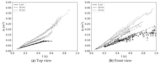 In the front view images, the cloud has a flat shape. Consequently, it is not possible to use strictly the same method to determine the radius of the cloud and the processing technique has been adapted. Instead of processing the whole image, only a horizontal line of pixels is processed. This line was taken five pixels above the floor which approximately corresponds to the height at which the head of the cloud reaches its maximum radius. The processing steps are illustrated in Figure 5. First, on each picture of the video, the line of pixels is extracted, and the background is subtracted. These lines are then assembled chronologically from top to bottom to form a kymograph (Figure 5a). The contrast of the kymograph is then enhanced using the CLAHE method (Figure 5b). The same two-edge filters [38,39] are then applied to get a binary image of the contours of the cloud. As artefacts of the background remained materialized as vertical streaks, only the vertical gradient of the image was kept (Figure 5c). In the last step, the left and right boundaries of the clouds are determined (Figure 5d). For that, the boundaries are first initialized as the boundaries of the container. Then the kymograph is processed line by line from top to bottom. The position of the left boundary on one line is chosen as the one of the leftmost contours detected on this line, in the limit of 50 pixels around the position calculated at the previous line. The symmetrical operation is performed for the right boundary. As for the processing of the images of the top view, the extraction of the contours is limited by the initial contrast of the images. Consequently, it is increasingly difficult to determine the boundaries of the cloud as it spreads. This is particularly visible in Figure 5c as fewer contours are detected as time evolves.