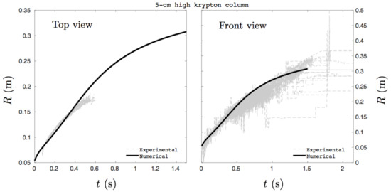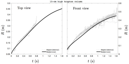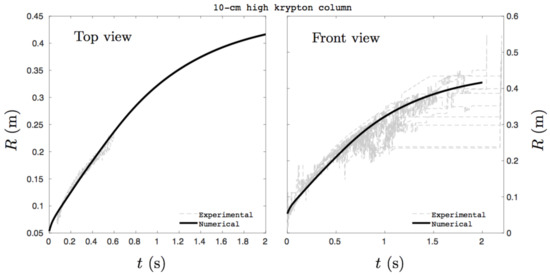 where kg mol−1 is the molar mass of krypton and J/mol/K is the ideal gas constant. Pressure and temperature equilibria between krypton and atmospheric air are assumed. It could be objected that, since krypton is expanded from a high-pressure bottle, it could be colder than the atmosphere. However, krypton flows slowly in a several-meter long pipe before arriving in the container and this pipe acts as a heat exchanger. Equation (16) is only used to provide the order of magnitude of the cloud Froude and Reynolds numbers for the various container heights as will be seen in Section 4.7. Consequently, assuming pressure and temperature equilibria between krypton and air seems reasonable.