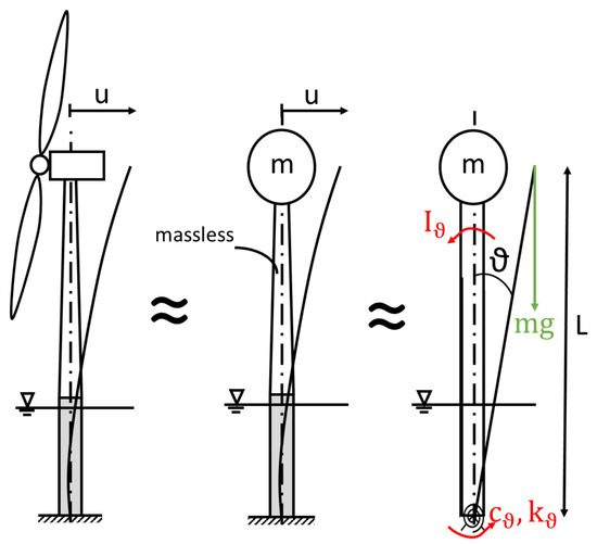 Assuming the tower-monopile assembly to be stiff and massless, the equation of motion for the first fore-aft bending mode in Equation (6) then reduced to the momentum equilibrium, in terms of , for an inverted pendulum freely rotating about a spring-damper hinge, as illustrated in the free body diagram on the right-hand side of Figure 2.