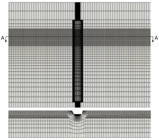 For the structural computations, the numerical wave flume is modeled by expanding the near field domain in Figure 3 up to 3D and by including the equivalent monopile model presented in Figure 2. As , with D the structural diameter, viscosity is not negligible, but as the Keulegan-Carpenter (KC) number corresponding to the peak of the input spectrum is still small () no vortex shedding is to be expected. Taking into account the absence of asymmetric vortex shedding and the structural symmetry, it is appropriate to model only half of the domain and the structure, applying symmetry boundary conditions at the symmetry surface, and thus saving considerate computational resources. The resulting three-dimensional mesh is shown in Figure 4. As can be seen in Figure 4, throughout the mesh in the x-direction the target refinement is withheld. For the y- and z-direction, gradual refinement is adopted towards this target refinement in the vicinity of the monopile and the wave surface. As part of the benchmark, this target refinement about the monopile and the free surface will be varied.