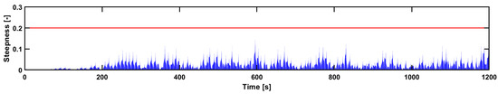 Firstly, no breaking model is included in HOS-NWT, while waves in OpenFOAM might prematurely break, i.e., before reaching their breaking limit, or lose energy to dissipation. Although publicly available HOS-NWT does not incorporate breaking models and dissipation, it does include a limit to the steepness above which the computation breaks down. Still, large peaks that overshoot the physics might be encountered. On the contrary, OpenFOAM’s interFoam solver does include viscosity and two-phase fluid interaction through diffusive transport equations for cell water fractions. The evolution of wave fields can therefore be expected to be more realistic in the sense that they are allowed to break. However, due to the dissipative nature of these transport equations, waves might lose energy to numerical dissipation. Therefore, a breaking detection was performed on the HOS output signal for with a the wave amplitude, the wave frequency and the wave limiting steepness. As this condition is only applicable for linear waves, the assessment of the wave breaking is based on a characteristic wave amplitude and characteristic wave frequency computed for each time instance by applying wavelet analysis along the lines of Liu and Babanin [33] with a limiting value, , of 0.2. As can be seen from Figure 6, the considered wave field from HOS is in no danger of breaking.