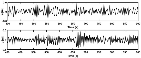 In the domain decomposition strategy, HOS is used to randomly generate a time series by a wave maker boundary first. In previous work by Toffoli et al. [7,23], the higher-order spectral method (HOSM), has shown to yield statistically significant results regarding the influence of third-order nonlinearities on the occurrence of extreme waves in random wave fields. The higher-order spectral implementation typically resolves the Laplace equations in cyclic wave number space with nonlinear free surface boundary conditions formulated in Equations (1) and (2) with and respectively the vertical velocity and the velocity potential at the free surface, [25].